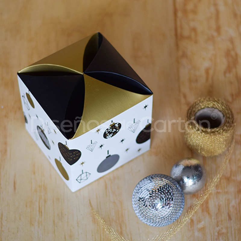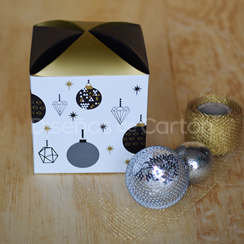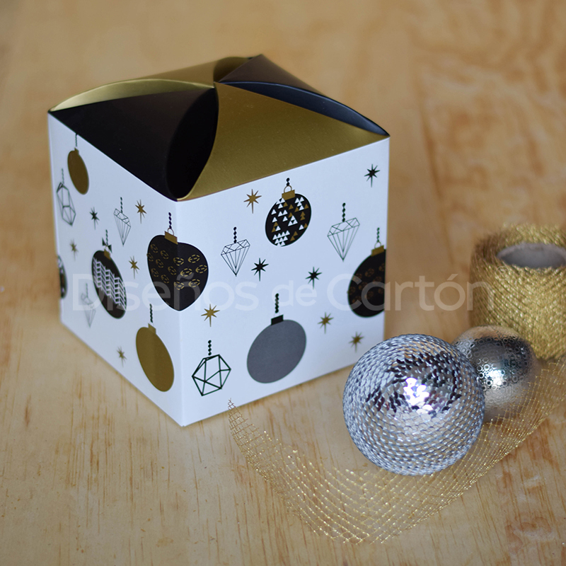 Cubo con un cierre original impreso con esferas sirve para obsequios navideños.